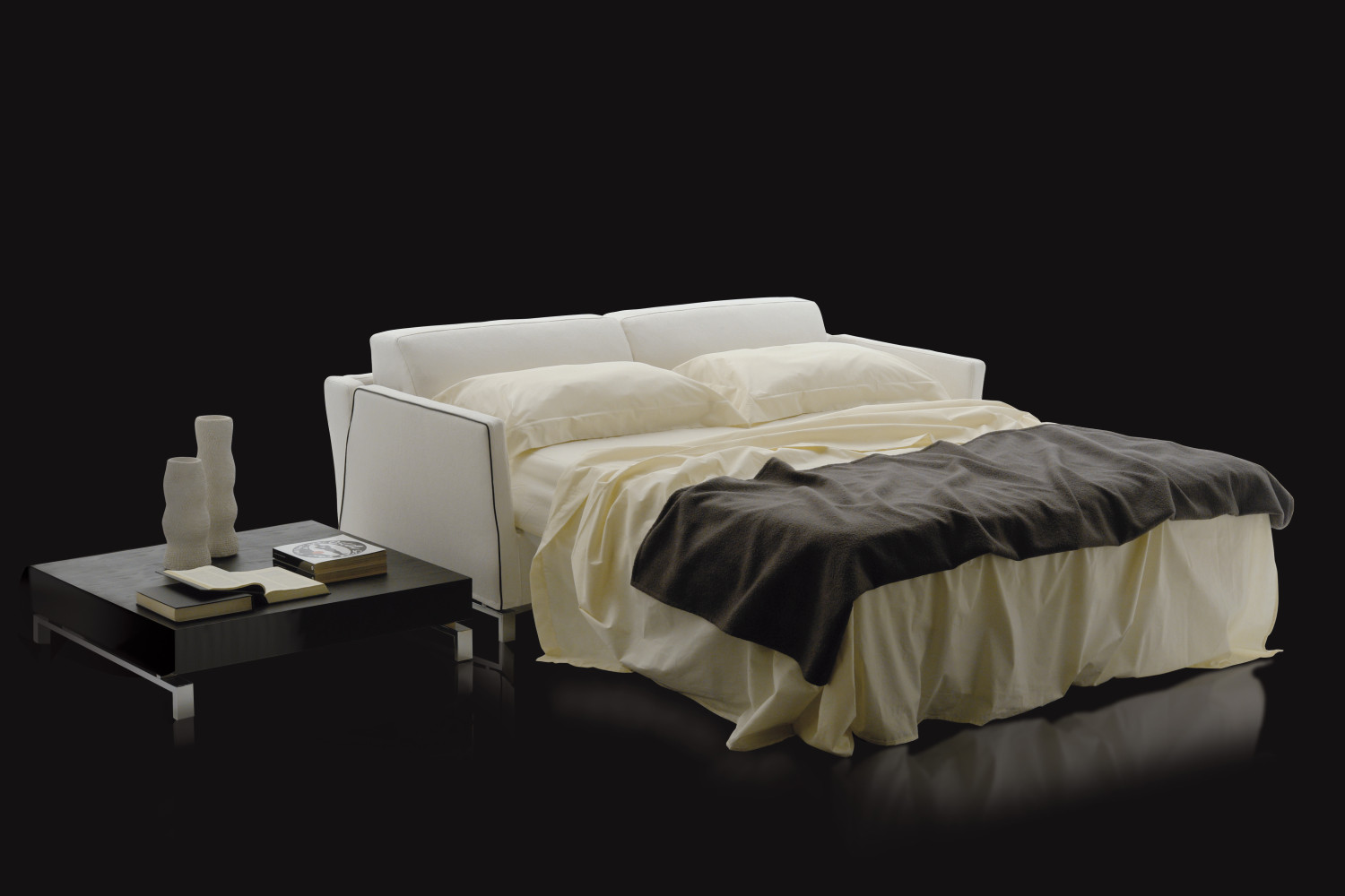 Диван можно легко открыть, а матрас и основание кровати развернуть в несколько простых шагов: вам нужно только снять подушки подлокотника и активировать ручной механизм с помощью ручки, скрытой в подушках сидений. После первого вытягивающего движения подушки сиденья вращаются под основанием кровати, а матрас разворачивается автоматически.